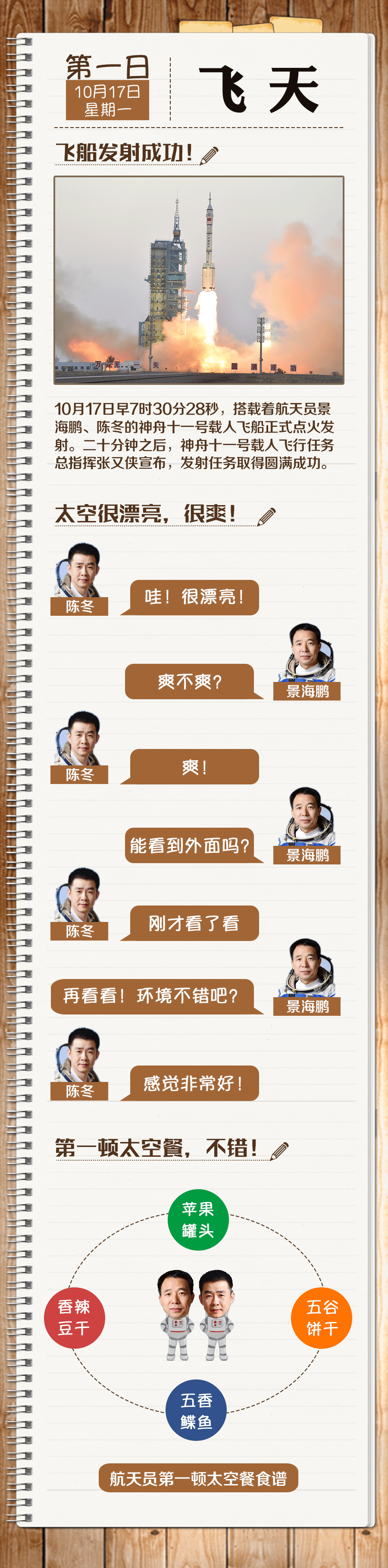 10月17日7时30分,神舟十一号载人飞船发射升空,宇航员航天员景海鹏、陈冬踏上前往太空的征程。19日早上6点24分,神舟十一号飞船上的航天员景海鹏打开天宫二号的舱门,二人顺利进入天宫二号,正式开启在空间实验室的30天生活。