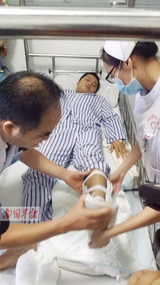 医护人员正在检查梁晓的伤腿。来源:广西新闻网-南国早报