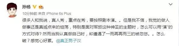 奥运冠军孙杨也参加了这档节目,他在10月28日傍晚却发微博感叹,说真人秀按照剧本演自己还不信,甚至认为特别是《真正男子汉》这样的节目,更不应该用“演”来对待,但当自己认真做自己时,却遭到了忽悠,孙杨还感叹自己心好累,并@了节目组。