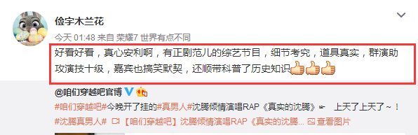 《咱们穿越吧》自播出以来,全国二十多位历史老师和学者联手推荐《咱们穿越吧》,纪连海、张颐武、知名媒体十余位主编、总监和资深媒体人也纷纷发声力挺,人民日报、光明日报和文汇报相继刊文点赞,《咱们穿越吧》在带领观众进行历史穿越的同时,堪称完成了一次真人秀的大穿越。