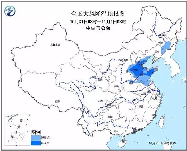 今天,冷空气继续东移南下,对华北、黄淮一带的影响开始显现。中央气象台预计,10月31日至11月1日,冷空气自北向南影响我国东部地区。受其影响,东北地区东南部、华北中东部、黄淮、江淮大部等地将有4~6℃降温,其中华北东部、黄淮东部等地的部分地区降温可达8℃以上,上述部分地区并伴有4~6级偏北风;为此,中央气象台于10月31日06时继续发布大风降温预报。