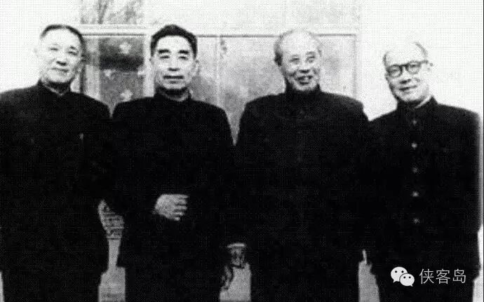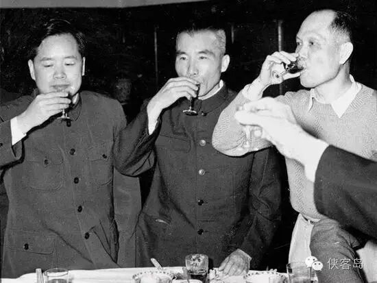 中共中央对台领导小组办公室主任罗青长(左一)与原国民党著名将领王耀武(左二)和覃异之。