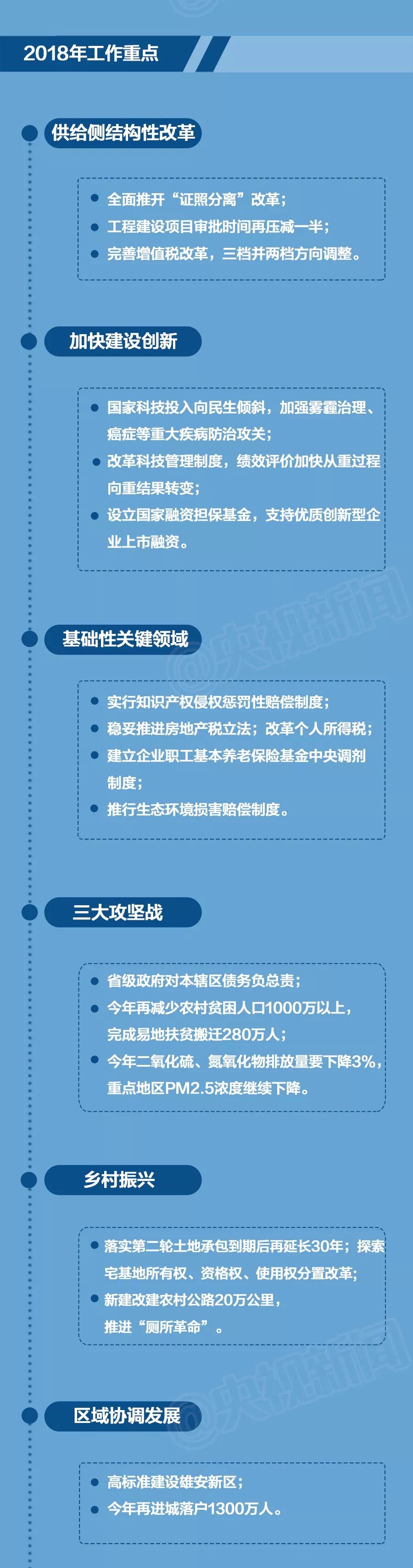 一张图看懂政府工作报告 纯干货 2018-03-05 16:58 央视新闻 0 今天(3月5日)上午,十三届全国人民代表大会第一次会议开幕,李克强总理代表国务院向大会报告政府工作。 小编梳理了政府工作报告中的要点、亮点、关键点,带你一图看懂,简式阅读。