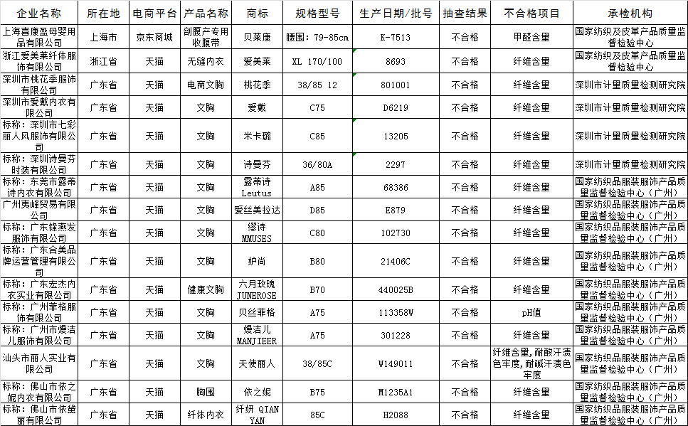 女士内衣不合格产品名单