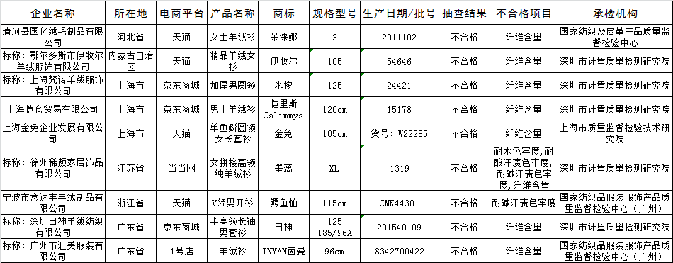 羊绒针织品不合格产品名单