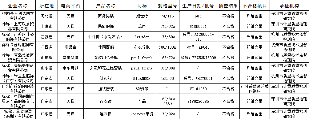 休闲服装不合格产品名单