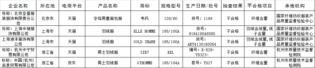羽绒服不合格产品名单