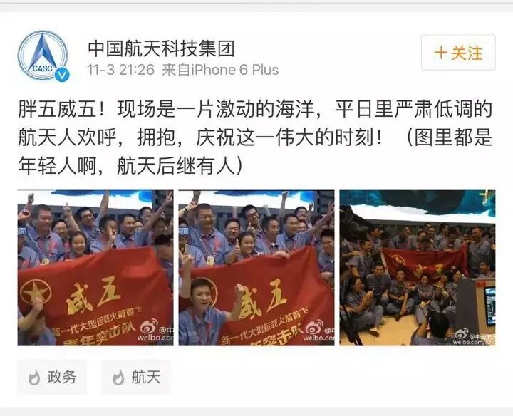 发射当晚,中国航天科技集团官微发出几张航天人庆祝胜利的照片,