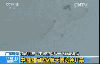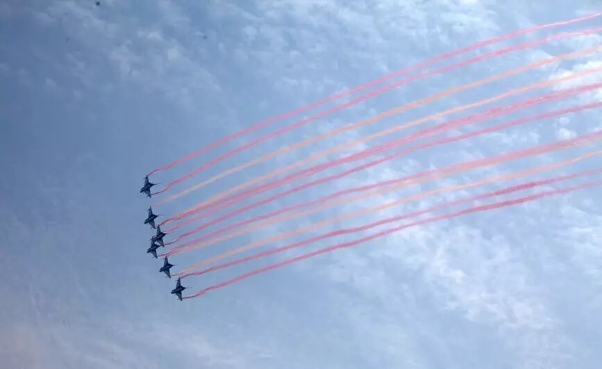 △ 中国空军“八一”飞行表演队驾驶歼-10战斗机进行了精彩炫目的特技飞行表演。