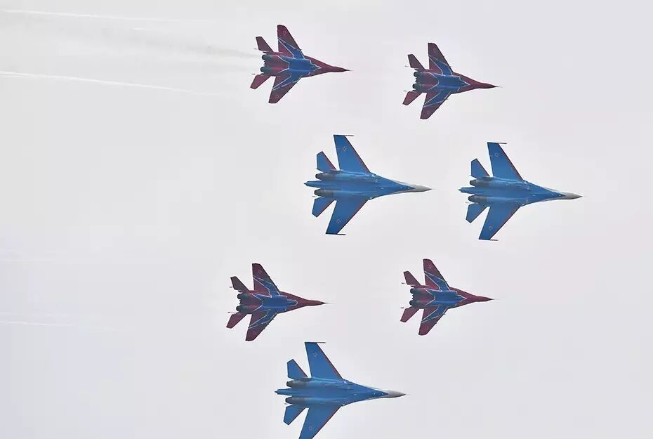 △ 俄罗斯“雨燕”特技飞行表演队的米格29(红)与装备苏27战斗机的“勇士”飞行表演队(蓝)混编飞行。