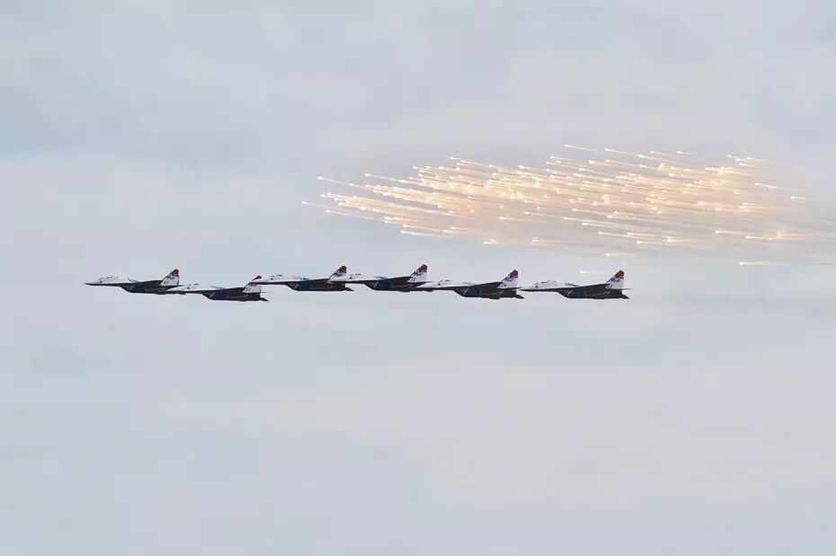 △ 俄罗斯“雨燕”飞行表演队的米格29进行飞行表演。