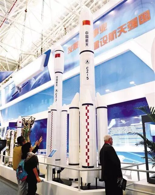 △ 这是宇航展区展出的长征五号运载火箭1:10模型(右)。