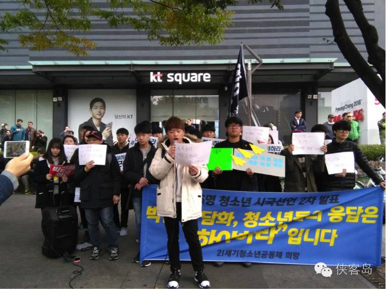 11月5日下午,光华门附近示威现场一角,青年学生在宣读“第二次时局宣言”,横幅上的黄色字体意思是:朴槿惠讲话,青少年们的回答是“下台”。