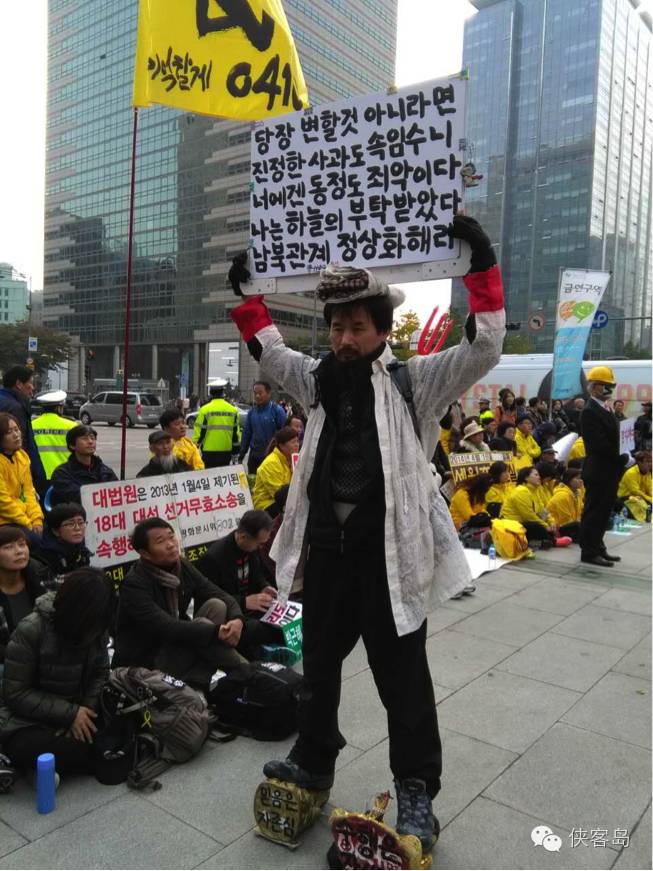 11月5日光华门广场示威现场,世越号沉船事件示威人群的一角。这位示威者背着三叉戟,手举的牌子上写着:“如果不能即刻改弦更张,即使真诚的道歉也只不过是一种骗术。对于你(朴槿惠),连同情都是一种罪恶。我受到了上天的嘱托。(命令语气,对政府的要求)改善南北关系!”