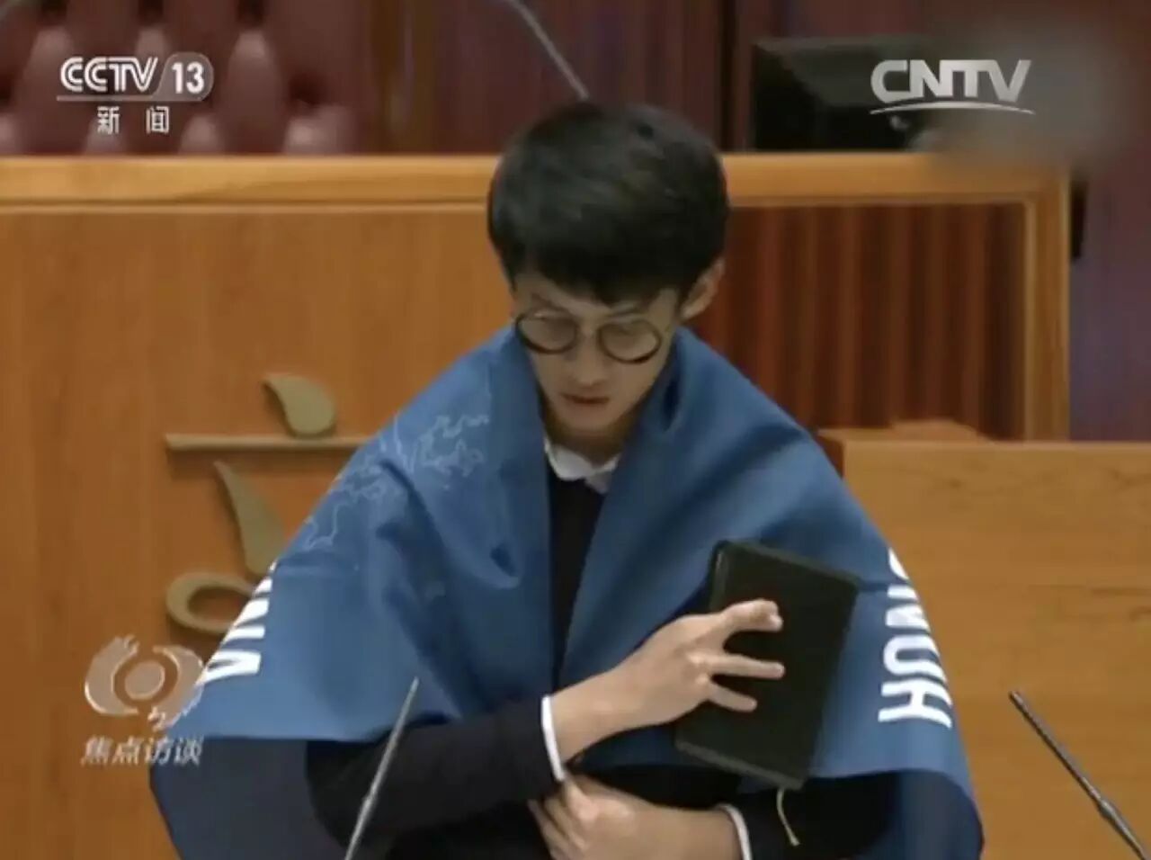 另一名叫做梁颂恒的候任议员则在宣誓时将一面宣称“香港不属于中国”的旗帜披在了身上,而且也在宣誓中把中国称作“支那”。