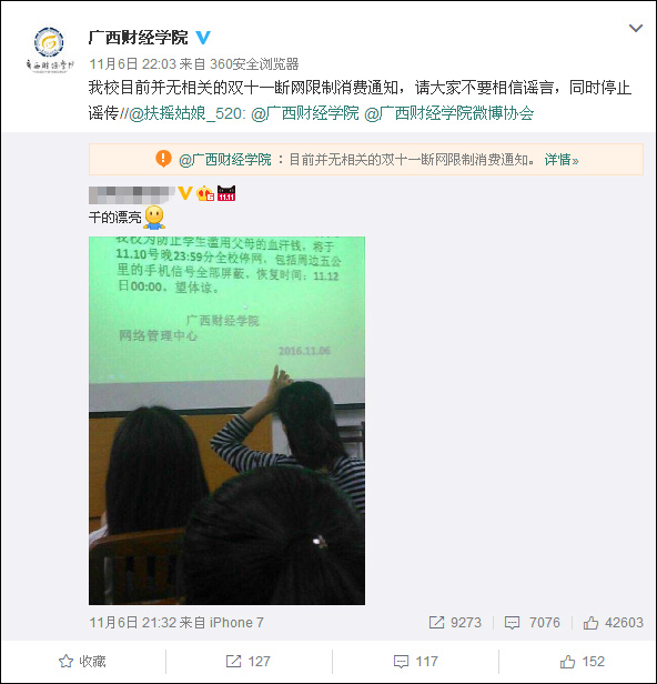 11月6日21时32分,某微博大V 贴出一则疑似来自广西财经学院的通告,通告称,学校为防止学生“双十一”滥用父母的血汗钱,将于11月10日晚23时59分全校停网,并屏蔽周边五公里的手机信号,12日零时恢复正常。“通告”的落款处写有“广西财经学院”和“网络管理中心”的字样。该条消息一经发出,就在短时间内引来围观和热议。