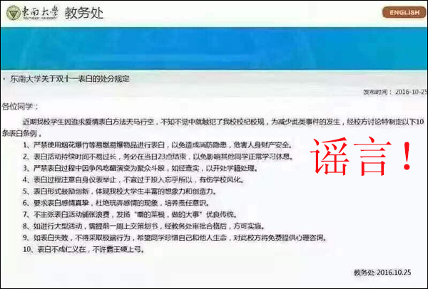 10月底,一张正文标题为《东南大学关于双十一表白的处分规定》的网页截图在网络流传。截图中,这份“规定”罗列了多条诸如表白时严禁使用烟花爆竹、表白持续时间不宜过长、鼓励形式创新以及进行大型活动需上交策划书等内容。10月29日,东南大学宣传部的相关负责人回应称,校方并未发布该份处分规定,网上流传的截图系恶搞。