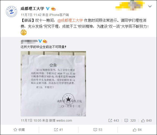 当天中午11时42分,成都理工大学官方微博辟谣称,“双十一”期间,学校作息时间照常进行,并提醒学生理性消费。