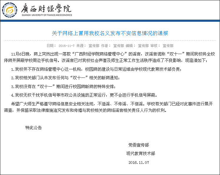 半小时后,当晚22时03分,广西财经学院官方微博对该条消息进行了紧急辟谣:我校目前并无相关的双十一断网限制消费通知,请大家不要相信谣言,同时停止谣传。11月7日,校方又在学校官方网站发布“关于网络上冒用我校名义发布不实信息情况的通报”,对谣言做出了四点澄清:1.学校并不存在网络管理中心这一机构;2.学校相关部门从未发布与“双十一”相关的任何断网通知;3.学校并无在“双十一”期间断网的特殊安排;4.学校无权干扰手机信号的正常运行。