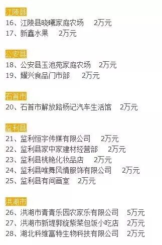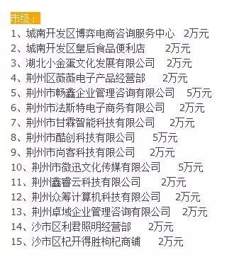 湖北省人社厅、湖北省教育厅、共青团湖北省委联合发布湖北省2016年大学生创业扶持资金项目名单,荆州28个大学生创业项目入选,分别将获得2万至5万元不等的资金扶持,共计扶持资金68万元。其中,市本级有15个项目,江陵县2个,公安县2个,石首市1个,监利县5个,洪湖市3个。