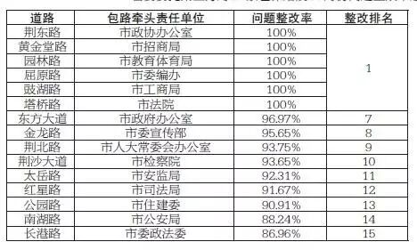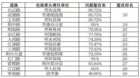 根据《关于进一步强化领导包路责任和明确包路工作任务的通知》(荆五创指【2016】2号)文件精神,市城管委委托第三方对29条包保路段10月份问题整改率进行考核。现将考核结果公布如下: