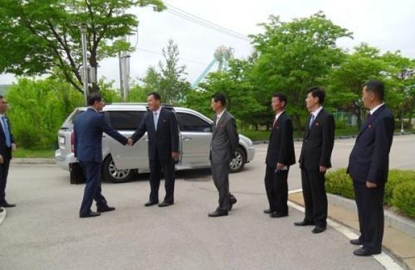 6月8日,在韩朝交流合作协议事务所前,韩朝共同联络事务所韩方考察团一行同朝方人士握手示意。