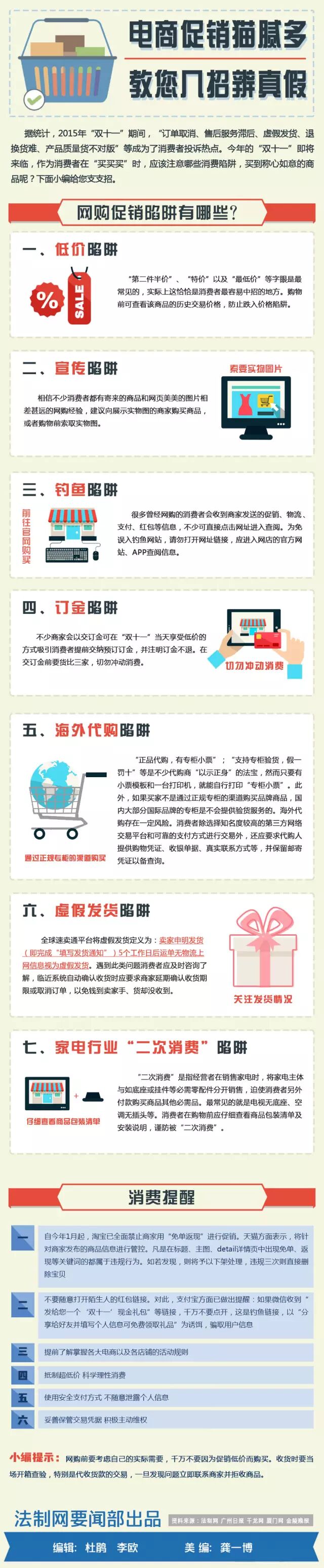 明晚准备熬夜剁手的伙伴看过来!有了这份攻略…… 2016-11-09 17:00 湖北日报 0 双11临近,各大电商的促销让人眼花缭乱,相信很多朋友都已做好了“剁手”的准备! 但是,物流太慢、售后无保障、后期维权难等问题都让人忧心。今年“双十一”,你还追不追?昨日(11月8日),湖北省消费者委员会提醒广大消费者理性消费,避免上当。 理性+机智=免剁手 5招教你如何防“坑” 衣橱里总是缺少一件衣服,出门的时候才发现没有搭配的包包,我还想要一双鞋纸……在这个“普天同庆”的购物狂欢日里,你的购物车“爆表”了吗?其实,你真的需要这些吗? 生活需求放首位 面对如秒杀抢购、定金预售、满抵、满送、满减等网购促销时,要多一份理性和耐心;明确所购商品是否为生活必需,否则再优惠买回家的商品也只是增加一件摆放物。 货比三家防受骗 应在多个电商平台的多个店铺进行横向比较,寻找性价比高的购买,详看商家信誉、商品价格、商品描述、评价等信息,综合对比。 细查电商官网地址 一些不法分子趁双11热销之机,利用消费者对网络知识的缺乏,伪造非法购物网站盗取消费者信息。因此,网购时切勿点击进入一些不熟悉的链接下单,要细心查看确认官方网址。 保质期短的物品错峰购买 双11购物,一些商品的送货时间很难保证,对一些保质期有要求的,应根据实际需求错峰购买,避免商品因物流受阻到手后过期。 保留好维权证据 非常重要!!! 网购同样有向卖家或电商平台索要发票等购物凭证的权利,与客服人员的聊天记录和订单信息也属重要维权信息,需保存。 给我给我一双慧眼吧 让我把陷阱都看清!! 一、商品“先涨后降” 在11.11前期将价格售价进行上调,然后再通过折扣、促销、返券等活动利诱消费者进行购买。这是目前电商促销最常使用的手法,其实这种方面早在之前的实体店宣传中就已经广泛使用,经过包装确实可以将消费者的目光所吸引,毫不避讳的说这种手法充斥着各种电商购物节,原因很简答:简单+好用。 小贴士:“距离‘双十一’还剩几天,想买的物品可以先收藏,等双十一那天看是否会降价。再者,若有条件的话可以先去商场探个风,让心里有底。 二、商家人气赚够,“特价”缺货很坑 以超低的价格诱惑消费者进行购买,然后再以没有货作为托词做到不赔钱,这可以看做是一个商家的炒作手法,目的就是要将消费者的目光通过某一件“低价”产品吸引到自己店铺,招揽人气。如果您与服务人员进行交涉往往会得到其他产品的推荐,这种做法虽然种宣传手段,实则已经对消费者造成了欺骗。 小贴士:应对次招术,只能尽量减少时间的浪费,在选择好产品后多收藏几家店铺,在促销时对比一下然后下单。 三、秒杀形式不靠谱 就目前来说,秒杀这种形式确实可以吸引一部分目光,但是想秒掉它难于上青天。有些无良商家放出了秒杀信息之后会在后台自己进行操作,将秒杀产品自己买掉,给用户以抢光的假象;就算商家老实的提供了秒杀商品,黄牛们也会用秒杀软件不断刷新链接造成同一时刻的网络拥堵。所以,秒杀看起来很美,只是看起来而已。 小贴士:关于秒杀这里并没有完美的鉴别方法,只有一些实战经历与大家共同讨论。秒杀活动如果只是一两台产品那您就可以不用考虑了,基本上商家有诚意的秒杀活动会拿出一定数量出来;秒杀过程中如果出现网络假死先不要着急刷新网页,等待一段时间看看也许会有奇迹发生;最后,您最好有一个无敌的网络。 四、假“客服”打电话称有退款 消费者受骗真实案例:“‘双十一’当天支付成功后接到假淘宝客服电话,称支付系统出了问题,需要退款给买家。” 小贴士:遇到此情况先打开淘宝和卖家确认。 五、“快递”变“慢递” 当“双十一”遇上APEC,恐怕没有一家能做到毫不拖延。尽管快递商们都为11.11做好了准备,但是茫茫多的货品实在是无法同一时间运输,变“慢递”也属于无奈。 小贴士:最根本的预防手段就是错开那段高峰时期,前面我们也说过并不是所有产品都会有巨大的优惠幅度,在消费者调查好之后可以选择错开高峰期出手(最好提前出手),这样可以避开快递高峰期;当然,如果真的有实惠的物品需要在高峰时期购买的话,用户记得与客服协商选用指定快递。 快把这些移出你的购物车!! 近日记者做了调查,让市民列一列往年双十一购物的“后悔清单”,家用小电器、服饰化妆品和食品占到前三位。 No.1 去年买的小家电 今年落灰了么? 榨汁机、扫地机器人、空气炸锅……这些电器你都买过么?冲着提升生活品质去消费,但是实际作用却因人而异。在记者的调查中,被这些电器的优惠吸引,买后一年也用不到几次的消费者占了很大比例。 消费专家提示:购买这些新鲜产品是人的天性,但是买之前最好估计好今后的使用情况,以免闲置后悔。“这些电器普遍属于小家电,价格1000元左右,因为双十一价格往往会跳水让人觉得非常实惠,加之总是很新鲜,让人感觉很需要,但其实和各人生活方式习惯有关,并不适合所有人。” No.2 便宜化妆品临近保质期 “爆款”衣服多闲置 在记者调查的“后悔清单”中,服饰化妆品占到第二位。 钱小姐告诉记者,去年双十一时,她看到一套平时舍不得用的化妆品促销,心痒痒的她立刻决定下手。“买完对这个价格还是比较满意的,但是收到才发现,这套化妆品的保质期只有几个月了,顿时知
