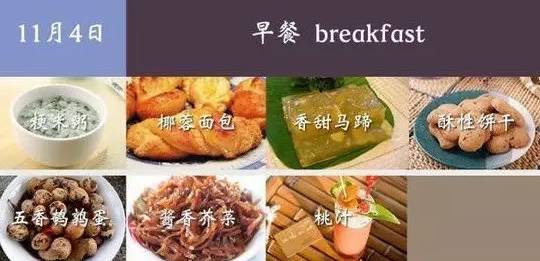 比如早餐,包括粳米粥、椰蓉面包、五香鹌鹑蛋等。