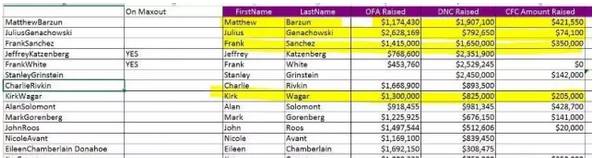 根据被泄密的邮件,民主党阵营向大量捐款的大“金主”许诺了重要职位。包括多个大使职位和委员会主席。黄色标明的为奥巴马竞选时的大金主。