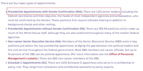 第一、PAS级别,总统提名并且需要通过参议院批准(1212个名额)。