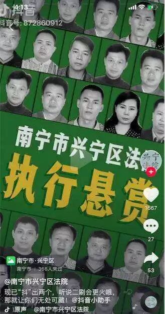 再如,广西南宁市兴宁区法院首创“抖音悬赏”,利用抖音视频,将当地10名“老赖”的清晰照片、基本信息、案件概要、悬赏专线和申请执行的标的金额生动呈现,获得广泛好评。