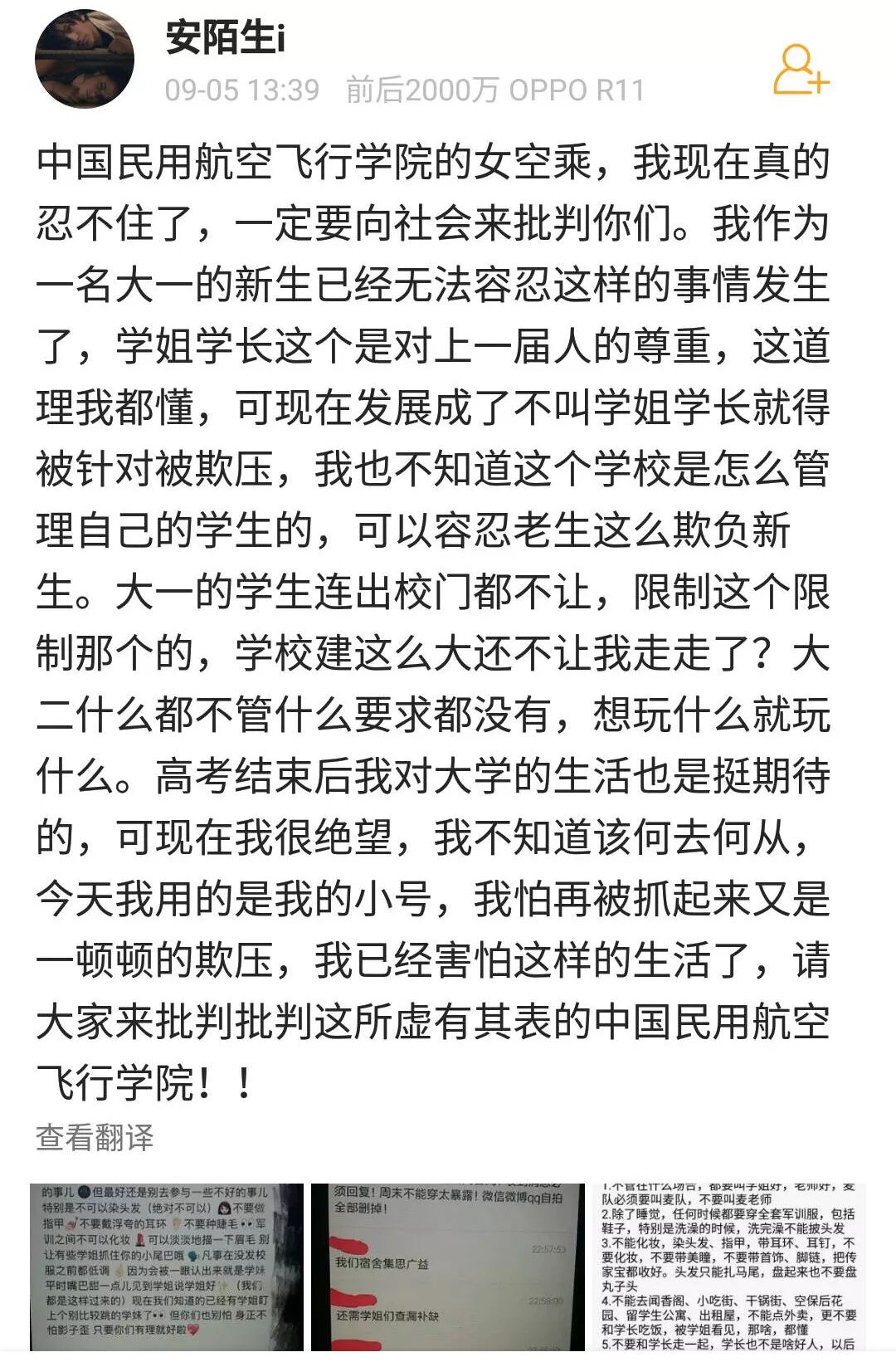 据北京青年报消息,19日下午,一位自称中国民用航空飞行学院的大一新生发微博称,学校“出现校园霸凌”,入校后受不了学姐等级森严的制度,被学姐欺压。