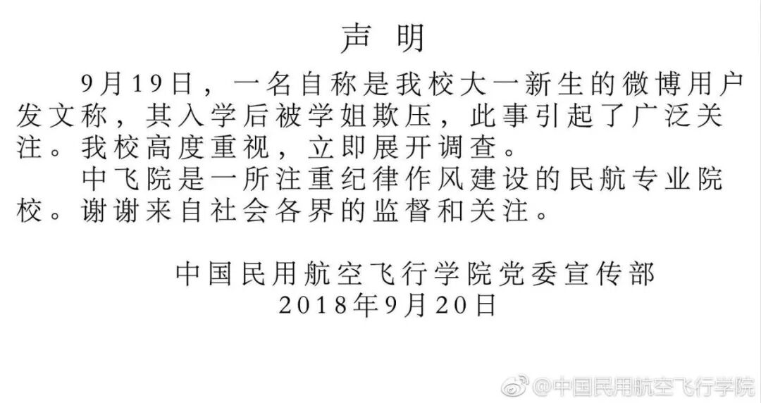 “一名自称是我校大一新生的微博用户发文称,其入学后被学姐欺压,此事引起了广泛关注。我校高度重视,立即展开调查。中飞院是一所注重纪律作风建设的民航专业院校。谢谢来自社会各界的监督与关注。”