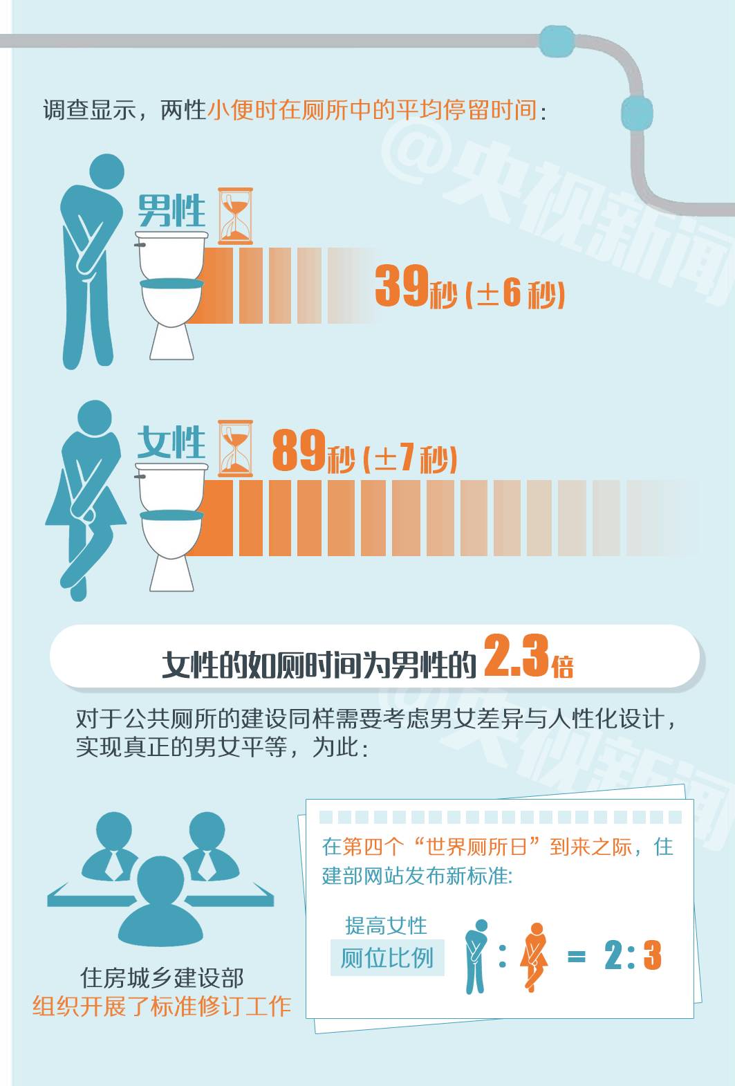 为缓解女性厕位紧张的问题,住建部网站日前发布新标准:女性厕位与男性厕位的比例提高到3:2,人流量较大地区则为2:1。
