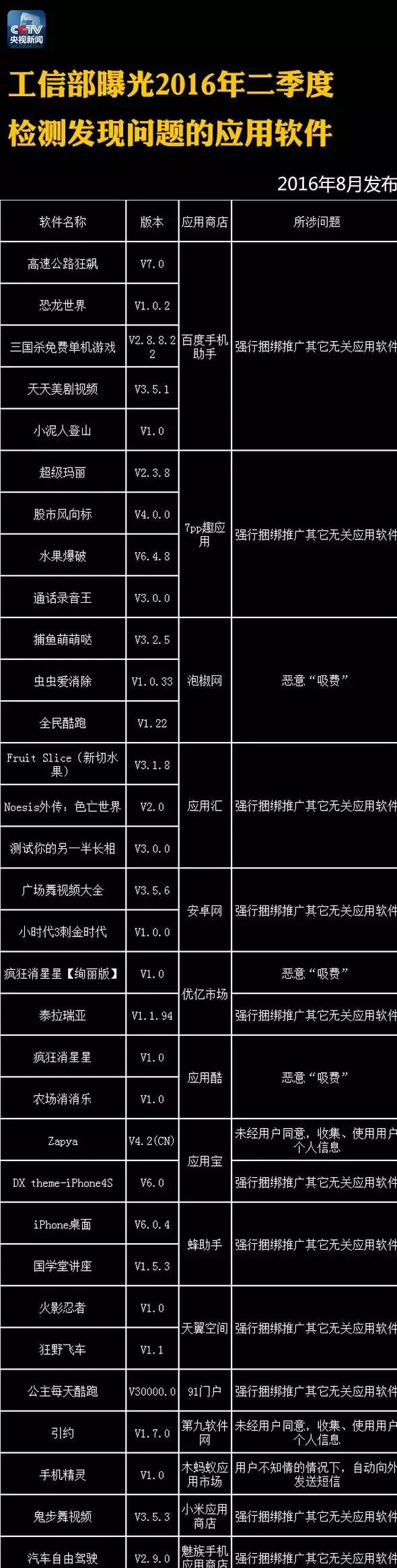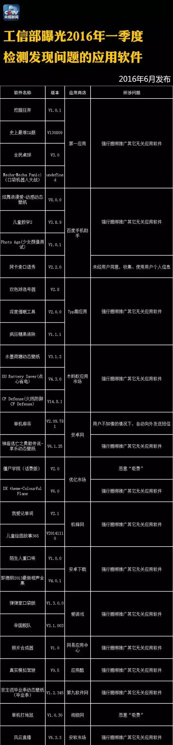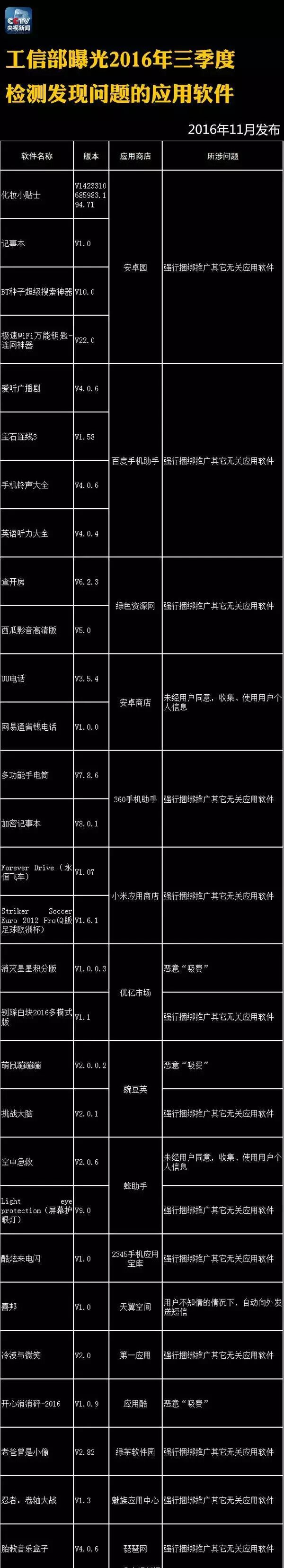 今年三季度,工信部对50家手机应用商店的应用软件进行技术检测,发现违规软件29款,涉及违规收集使用用户个人信息、恶意“吸费”、强行捆绑推广其他无关应用软件等问题。