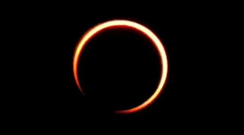 当太阳、月球和地球排成一条直线,月球位于两者之间时就会发生日食天象。日食又分全食、环食和偏食,如果当天月球距离地球较远,而太阳距离地球较近,月球的视圆面较小而不能全部遮掩太阳,就会发生日环食。日环食发生时,天空中的太阳变成了一个圆环,金光灿灿犹如一只‘金指环’。