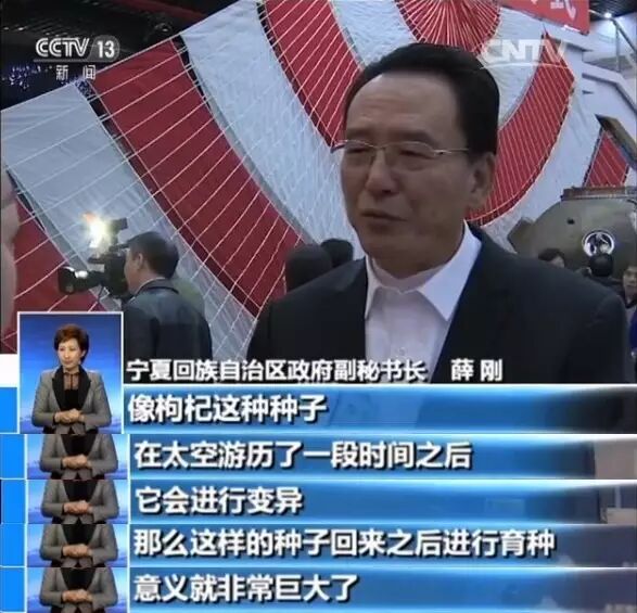 宁夏回族自治区政府副秘书长薛刚告诉央视记者,像枸杞这种种子在太空游历一段时间之后会发生变异,这样的种子回来后进行育种意义非常重大。