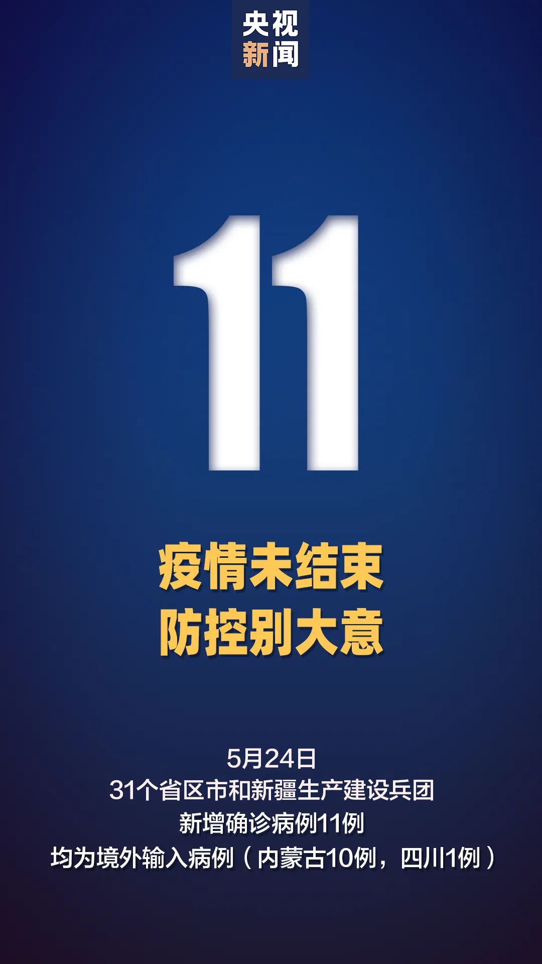 5月24日0—24时,31个省(自治区、直辖市)和新疆生产建设兵团报告新增确诊病例11例,均为境外输入病例(内蒙古10例,四川1例);无新增死亡病例;无新增疑似病例。