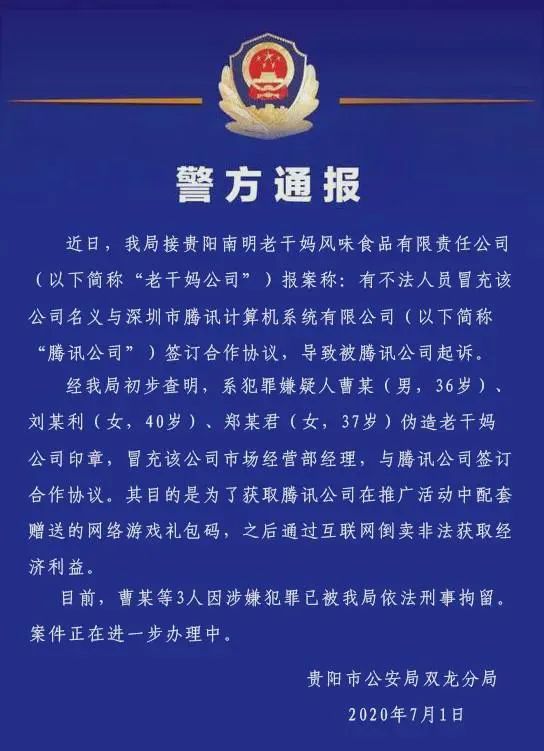 今天中午,贵州贵阳警方通报3人伪造老干妈印章与腾讯签订合同,已被刑拘。