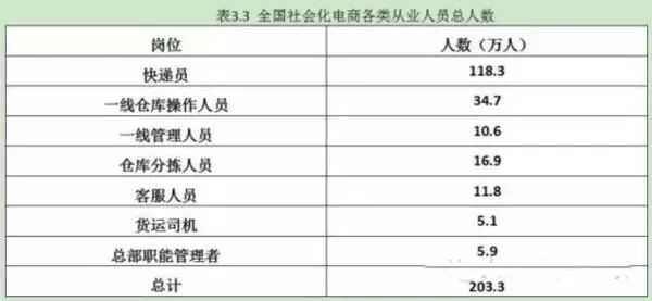据北京交通大学、阿里巴巴研究院、菜鸟网络共同发布的《全国社会化电商物流从业人员研究报告》调查显示,全国社会化电商从业人员总数为203.3万人,其中一线人员163.6万人;二线人员33.8万人;三线总部职能人员5.9万人。