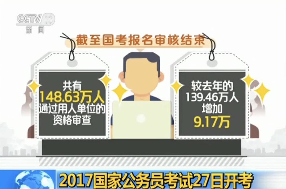 明天(11月25日),2017年度中央机关及其直属机构公务员招考笔试将开考。本次公务员考试共有148.63万人通过报名资格审查,较去年增加了9.17万。