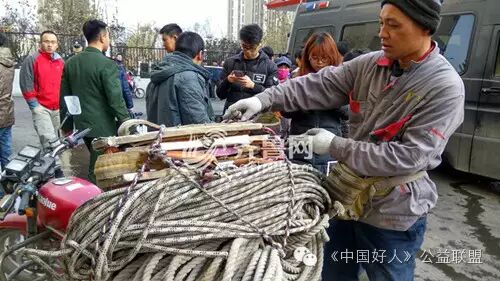 问了半天,他们才告诉记者,自己是旁边工地的工人,工作是外墙清洗,身上背着的这些行头,就是他们的施工工具。说到今天的救援,四个人说,没什么好提的,都是小事。