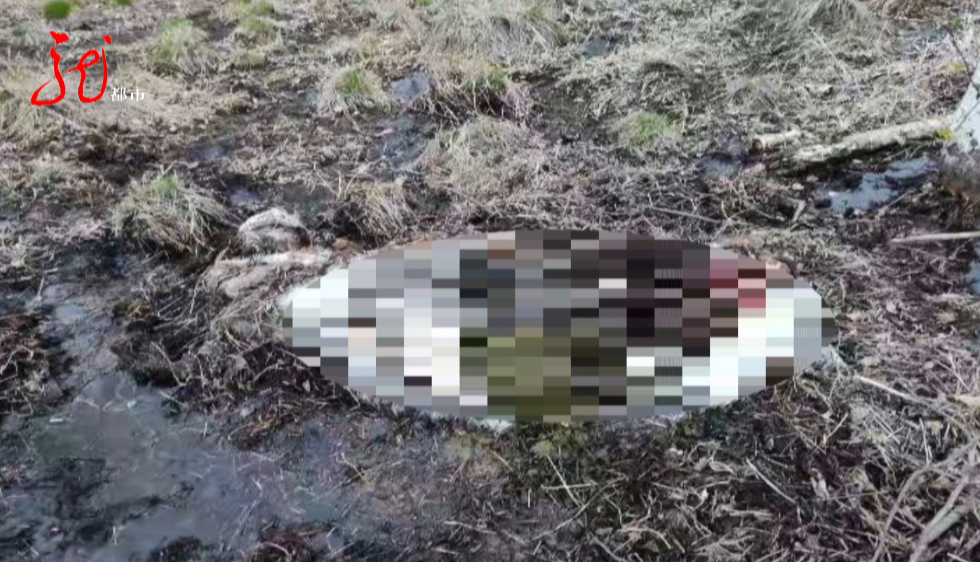 大兴安岭边境管理支队呼玛大队金山边境派出所民警 宋哲元发现母牛已经被棕熊用枯草和泥土掩盖起来,四周全是棕熊的足印,母牛的肚子已经被掏空,后腿的肉也没了。