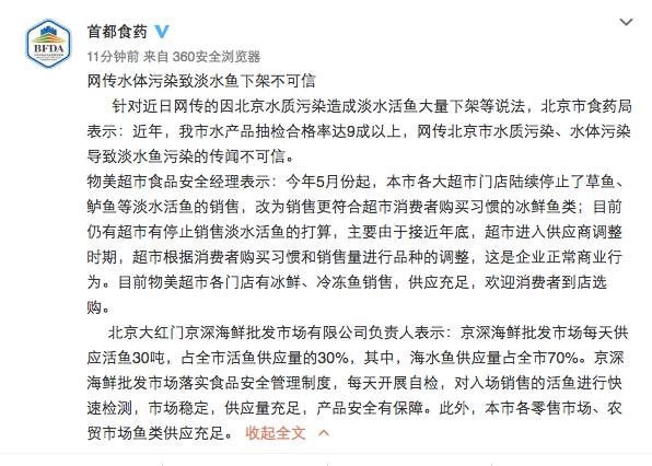 针对这一网传说法,北京市食药监局给出回应称:传闻不可信。部分超市停售淡水活鱼属于企业自主行为。北京市水产品抽检合格率常年达9成以上,于不合格产品,会依据《食品安全法》规定作出相应处理。