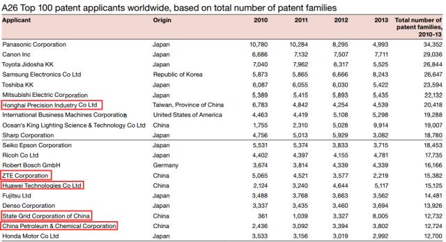 记者注意到,报告指出,2010-2013年累计申请专利最多的100家企业中,前三名皆为日本企业,来自我国台湾地区的鸿海集团排在第7,而中兴、华为、国家电网和中国石化则位列TOP20。