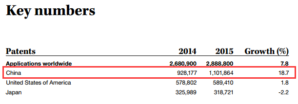 11月23日,世界知识产权组织(WIPO)在日内瓦总部发布了《世界知识产权指标》年度报告。该报告显示,2015年中国国家知识产权局受理的专利申请数量超过110万件,这是全球首次有国家突破百万大关。