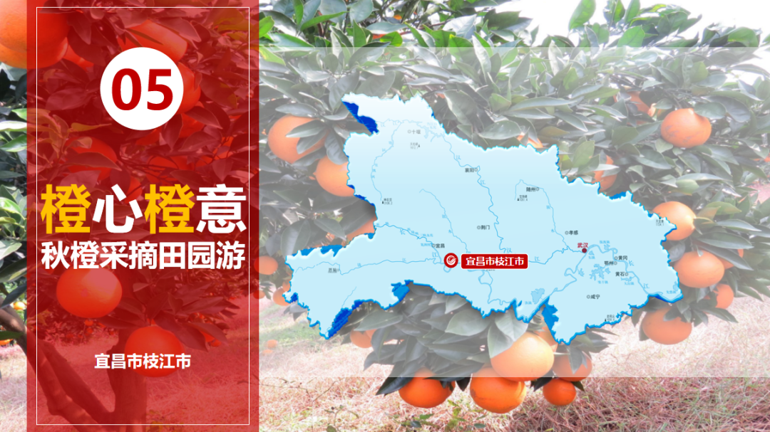 近日,由湖北省文化和旅游厅、宜昌市人民政府联合举办的第二届荆楚乡村文化旅游节在枝江市开幕。节会上发布了“橙风破浪”“橙心橙意”等10条湖北省柑橘采摘线路。其中,荆州1条柑橘采摘线路上榜!