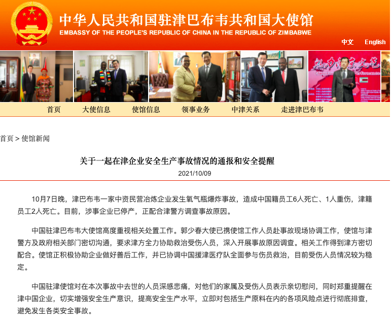 记者留意到,此前津巴布韦马佐韦区(Mazowe)警察局已通报该事故。通报指出,该局正在调查发生于10月7日马佐韦区SAS金矿气罐爆炸事故,该事故目前造成6名外国人等多人死亡,另有1人重伤送院。