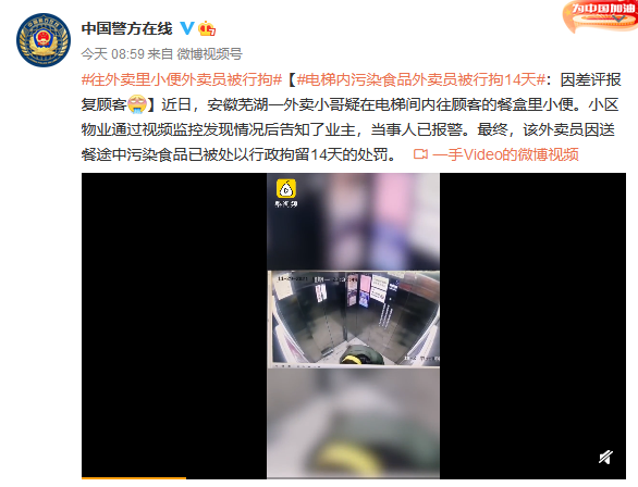 近日,安徽芜湖一外卖小哥疑在电梯间内往顾客的餐盒里小便。小区物业通过视频监控发现情况后告知了业主,当事人已报警。