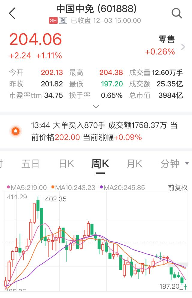 市场因素之外,中国中免受疫情影响和促销影响,业绩并不给力,三季度收入同比下降11.7%,实际经营性归母净利润低于市场预期。其股价也表现不佳,相比今年2月中旬创下的高点,当前股价近乎“腰斩”,市值为3984亿元,蒸发逾3700亿元。
